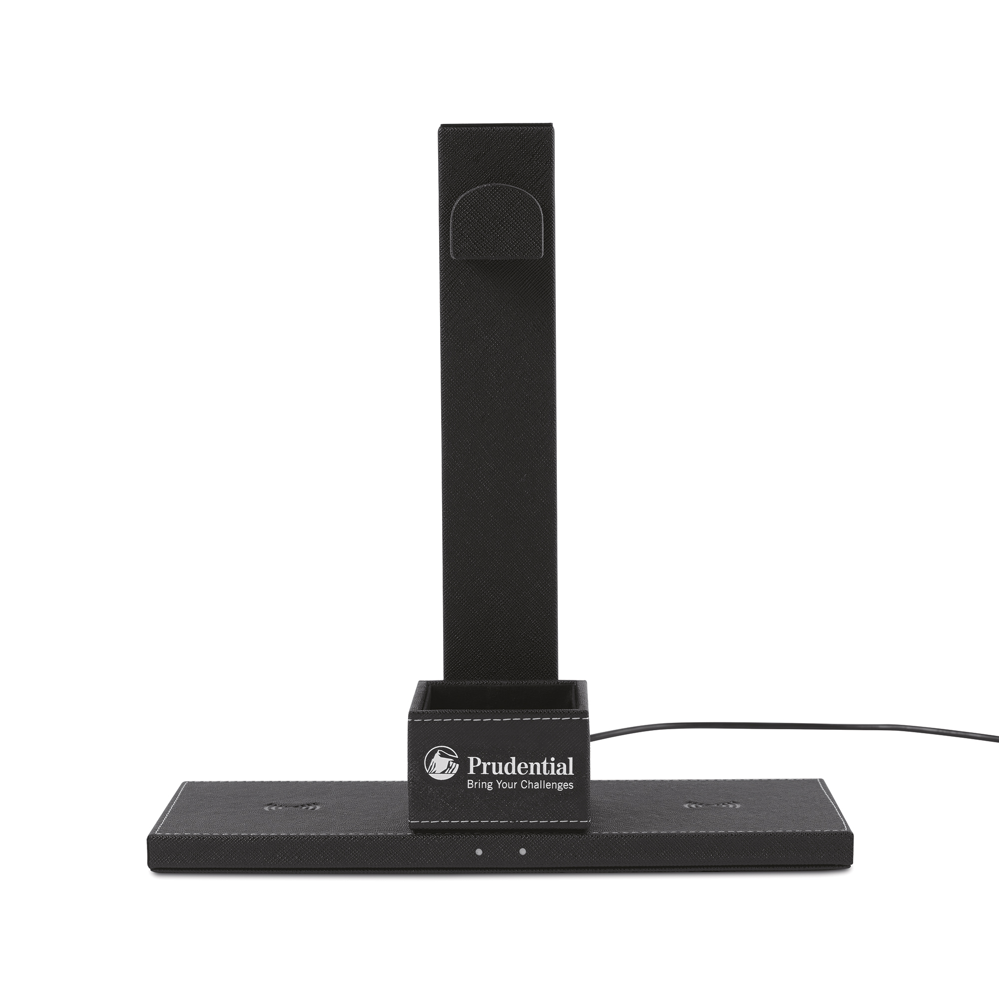 Keep your everyday essentials and small accessories close by and organized, making your desk clutter-free. Never misplace your headphones again. Integrated headphone stand provides a safe and accessible place to store your headphones when not in use. Wirelessly charge your devices. Anti-slip base. LED indicator illuminates when device is being charged or a metal object has been detected. Max. Output: 10W x 2. Max. Case Thickness: 0.2 inches.